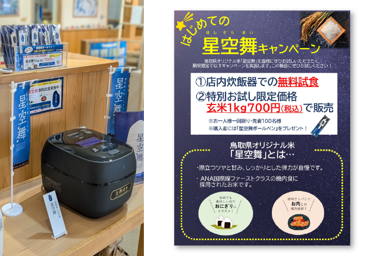 | 2026年02月17日 | 結の蔵「星空舞」キャンペーン開催中!店舗「結の蔵」にて、「はじめての星空舞キャンペーン」がスタートしました! 最高級炊飯器「炎舞炊き」で炊き上げた「鳥取県産 星空舞」の試食、お試し限定価格での販売を実施中です。 キャンペーン期間:2026年2月16日(月)~3月31日(火) ■お試し限定価格:玄米1kg 700円(税込)で販売 星空舞のご試食は【午後から】を予定しております。 鳥取県オリジナル品種「星空舞」同じ父親(良食味品種)を交配する「戻し交配育種」という品種改良で、おいしさにこだわって開発した品種です。 「星のように輝くお米」のイメージ通り、適度な粘りがあり、噛むと一粒一粒に弾むような「粒感」があります。水を抱き込む量が多いため、冷めても食感が変わらずおいしく召し上がれます。 |